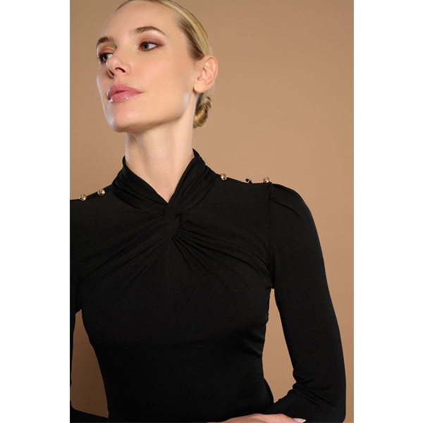 Camiseta de manga larga y cuello perkins en pico. Detalle de botones en hombros. Tejido elástico. Cierre en espalda con abertura y botón.