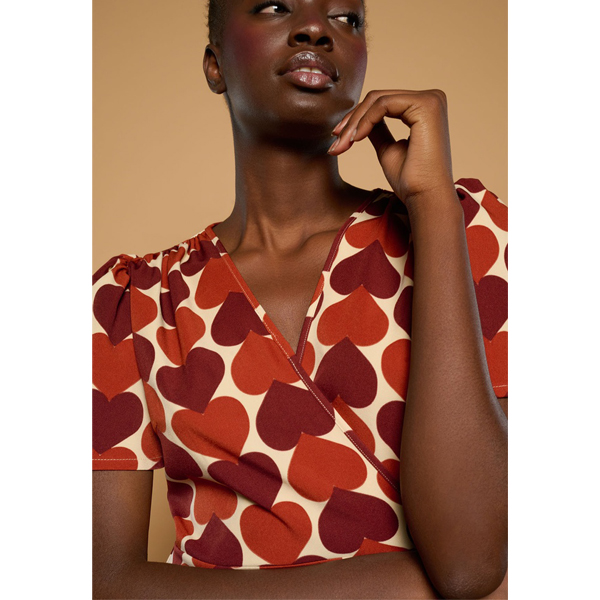 Vestido cruzado midi de manga corta acampanada y escote en pico. Tejido fluido. Estampado de corazones retro. Cierre con botón invisible y lazada en cintura.