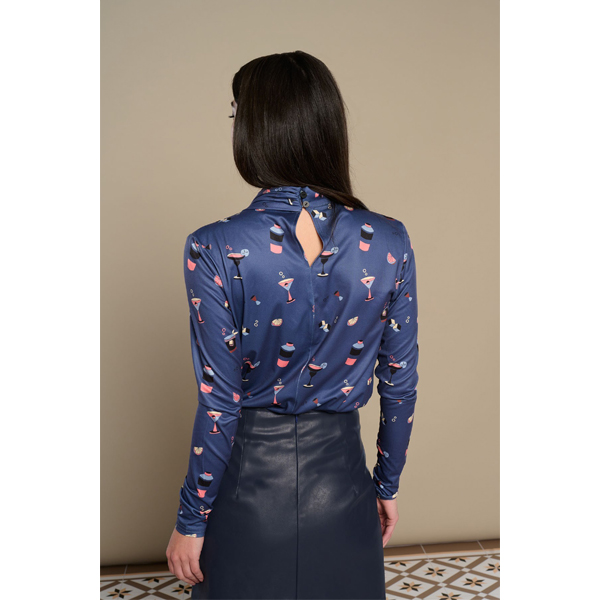 Camiseta de cuello perkins y manga larga. Tejido elástico térmico. Estampado coctel en azul.