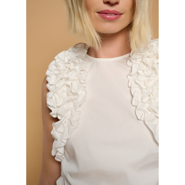 Camiseta de cuello redondo y manga sisa. Cierre con cremallera trasera. Volantes fruncidos en sisas. 100% algodón.
